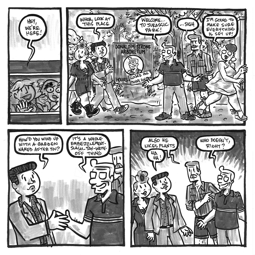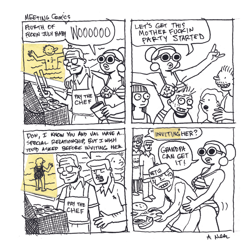 I decided I wasn’t just going to draw comics about work. I wanted the characters to have lives outside their jobs. I decided for the Fourth of July to draw a comic set at a party at Don’s house. I had established that Don was gay, and I wanted to figure out what his husband Terry looked like.